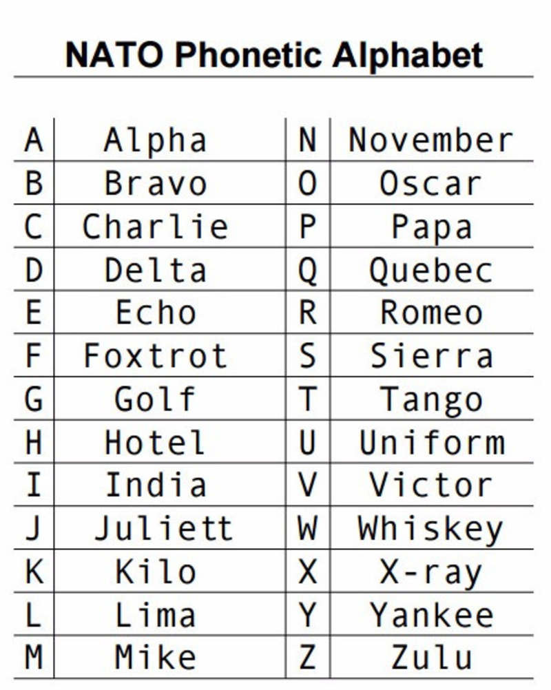 The nato phonetic alphabet is what people used during ww2 to make sure they didn't do something dumb because they misheard the orders through the radio, and is now more commonly used to make sure your name isn't misspelt when trying to set up a new account for your gas and electricity bills. See more ideas about phonetic alphabet, nato phonetic alphabet, alphabet list. June 24, 2016 by scott weingart, md fccm 6 comments. The nato phonetic alphabet is used worldwide in radio communications by militaries and civilians alike. All through the course of your day in the ed or the icu, you are relaying incredibly critical information to others. That missing the whole point of the phonetic alphabet though. Today, the nato phonetic alphabet is used for radio communication by aviation and maritime industries. The phonetic alphabet has been around for a long time, but has not always been the same, says thomas j. Instantly share code, notes, and snippets. Lift your spirits with funny jokes, trending memes. It is used to spell out words when speaking to someone not able to see the speaker, or when the audio channel is not clear. The nato phonetic alphabet, officially denoted as the international radiotelephony spelling alphabet, and also commonly known as the icao phonetic instead, the international civil aviation organization(icao) alphabet assigned codewords acrophonically to the letters of the english. Check out the video to learn more!